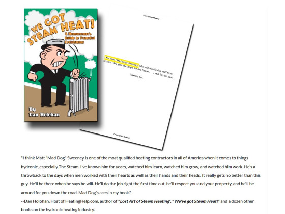 I am Matt "Mad Dog" Sweeney and if you follow my prescription, to the letter, I GUARANTEE that your heating system will be much quieter, as efficient as can be, and work as The Dead Men intended. My son, Matthew Jr. Has A Master's Degree in Environmental Engineering (specializing in Water treatment and Geothermal systems). Matt Jr. has tagged along with me since he was 5 years old and has personally installed Radiant Heating, Steam and hot water boilers, plumbing waste and vent and associated piping systems. He is a great technical resource for me. If needed, he can be consulted for his professional opinion. Call me and we will solve your heating woes, together. And one last thing: after we work together, I will NEVER ignore your calls or emails AFTER the the consult is done.